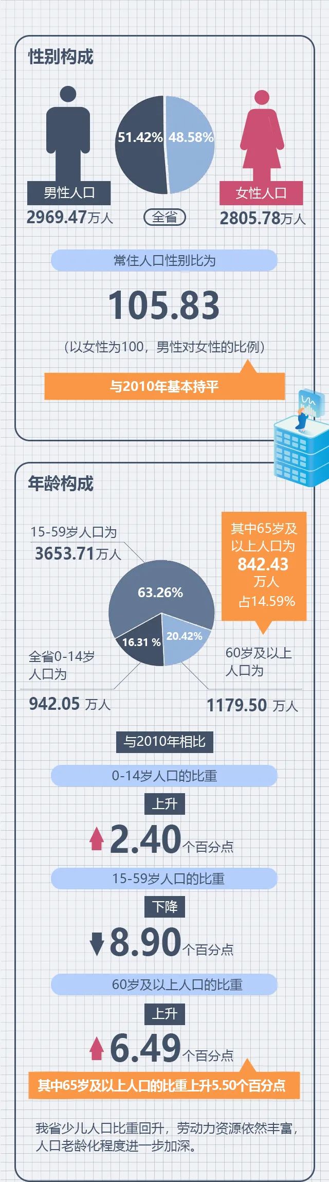 (四)性别构成。全省男性人口为2969.47万人,占51.42%;女性人口为2805.78万人,占48.58%。常住人口性别比(以女性为100,男性对女性的比例)为105.83,与2010年基本持平。
