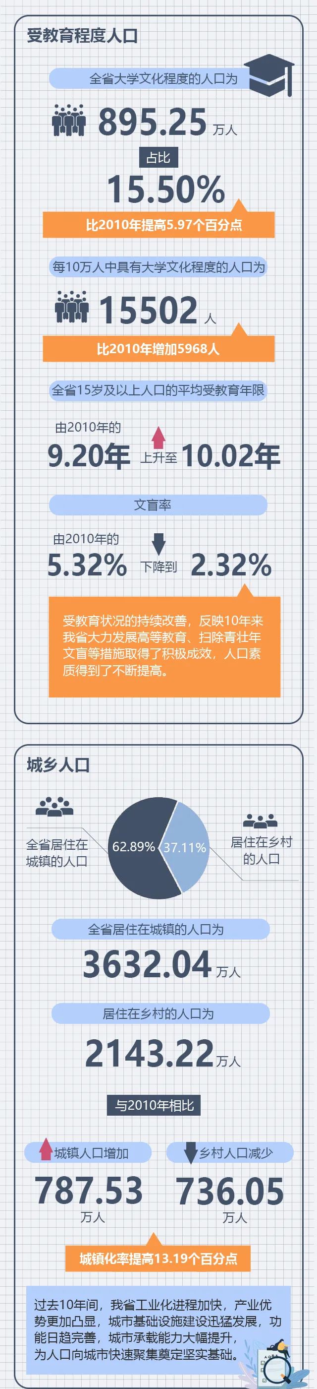 (七)城乡人口。全省居住在城镇的人口为3632.04万人,占62.89%;居住在乡村的人口为2143.22万人,占37.11%。与2010年相比,城镇人口增加787.53万人,乡村人口减少736.05万人,城镇化率提高13.19个百分点。过去10年间,我省工业化进程加快,产业优势更加凸显,城市基础设施建设迅猛发展,功能日趋完善,城市承载能力大幅提升,为人口向城市快速聚集奠定坚实基础。