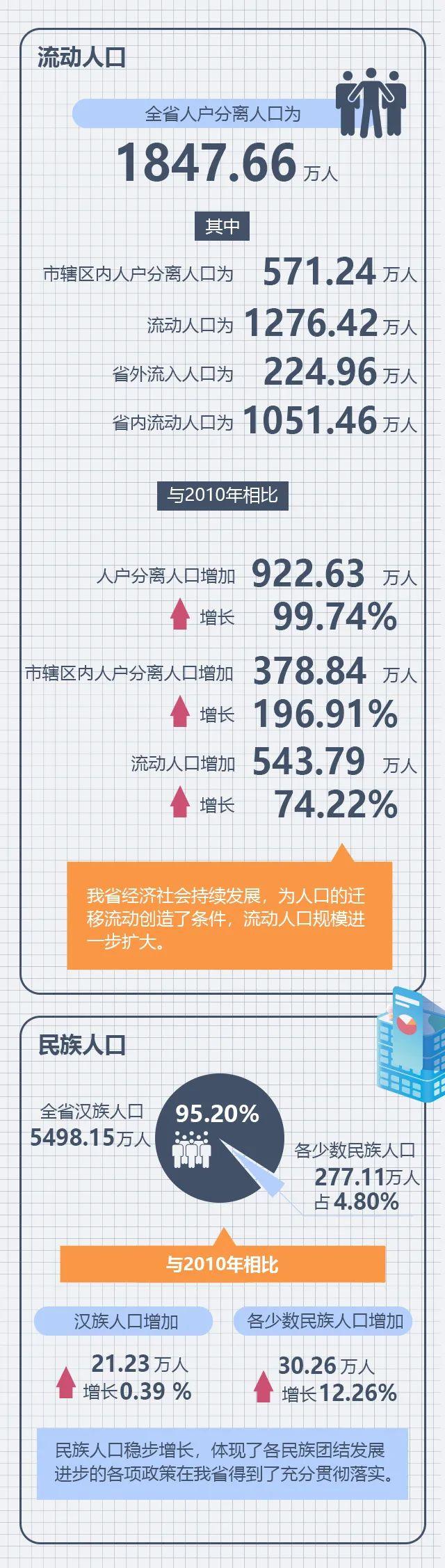 (九)民族人口。全省汉族人口为5498.15万人,占95.20%;各少数民族人口为277.11万人,占4.80%。与2010年相比,汉族人口增加21.23万人,增长0.39 %;各少数民族人口增加30.26万人,增长12.26%。民族人口稳步增长,体现了各民族团结发展进步的各项政策在我省得到了充分贯彻落实。