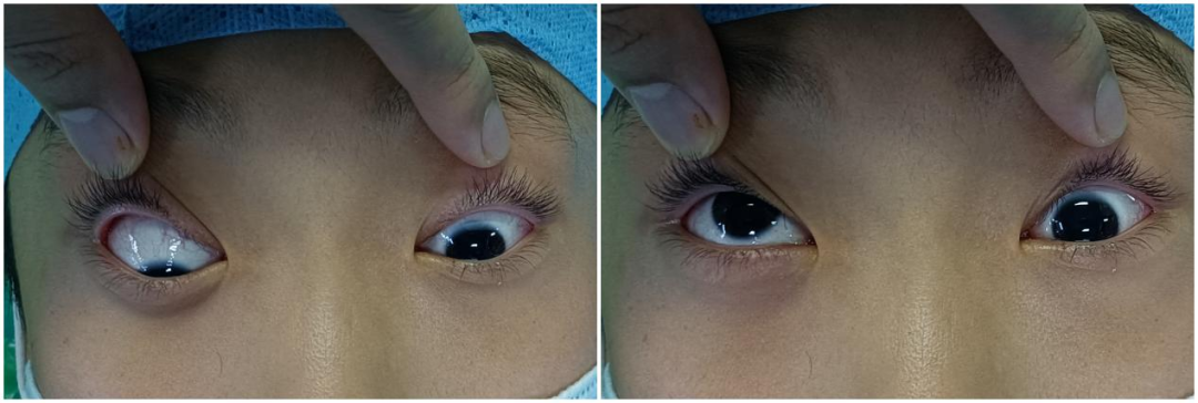 小杰的右侧眼球可以正常转动,但左侧眼球因眶壁骨折后肌肉嵌顿无法正常转动