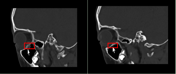 CT片显示,小杰的眼眶眶壁骨折,并且肌肉嵌到了骨缝里