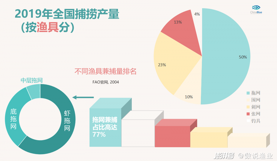 拖网是我国重要的捕捞作业方式,其产量在渔业类型中始终占首位。其中,虾拖网渔业的兼捕情况最为严峻,梭子蟹、鳗类等鱼、蟹便经常中招;底拖网作业则对兼捕幼鱼的危害最大,且对海底生境破坏力强,因此在我国近海主要经济区已被禁止(见后文"禁拖线");钓业尽管是选择性最高的渔业,但其对鲨鱼的兼捕率却达到了10%。除此之外,大型围网的兼捕物种最少,对渔业资源的影响也最小[2]。
