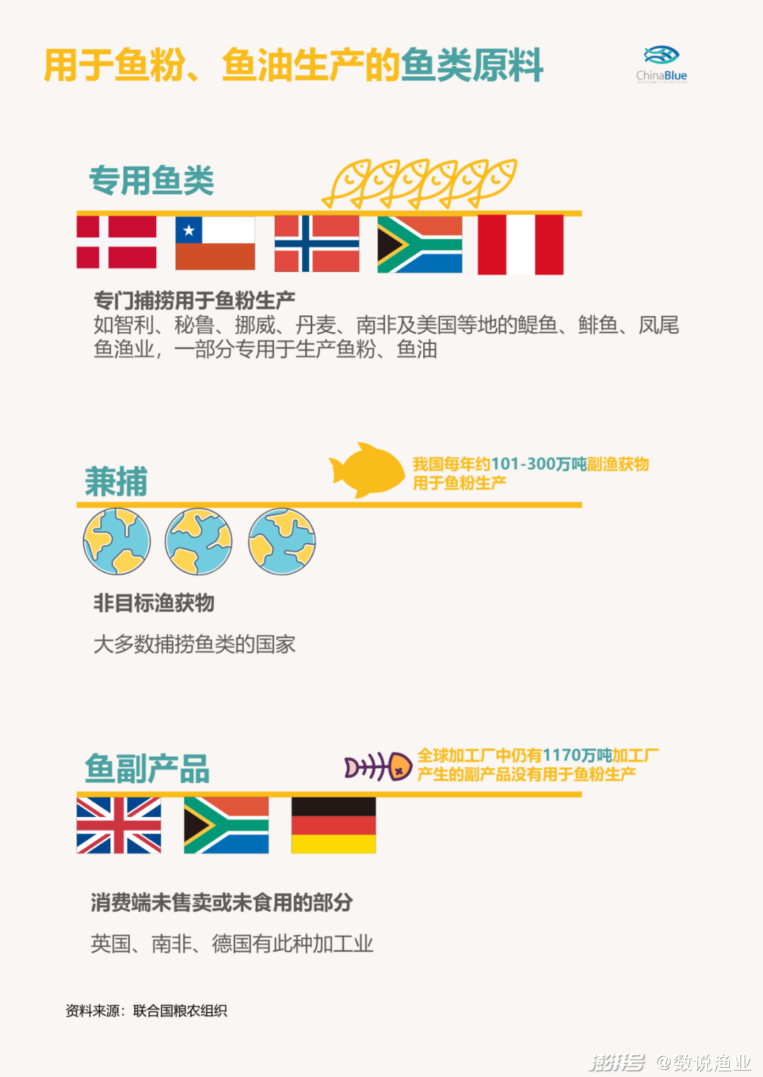 鱼粉、鱼油是水产养殖饲料中最主要的营养添加成分,原则上所有鱼类及大多数海洋生物都可以转化为鱼粉,目前其原料主要有三种来源。