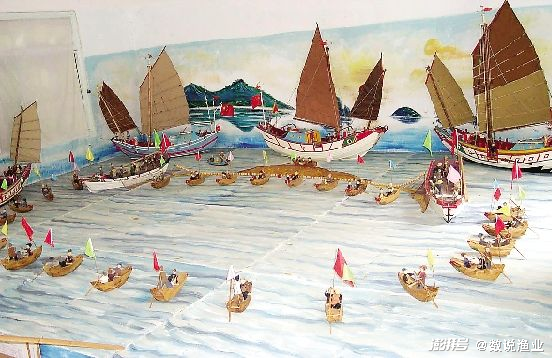 敲罟: 渔民利用声学原理,敲打绑在船帮上的竹杠,使水下声波与黄鱼头部的两个耳石产生共振效应,将黄鱼震昏,船队再把昏死的鱼群赶入大船张开的网中,以此收获大量黄鱼