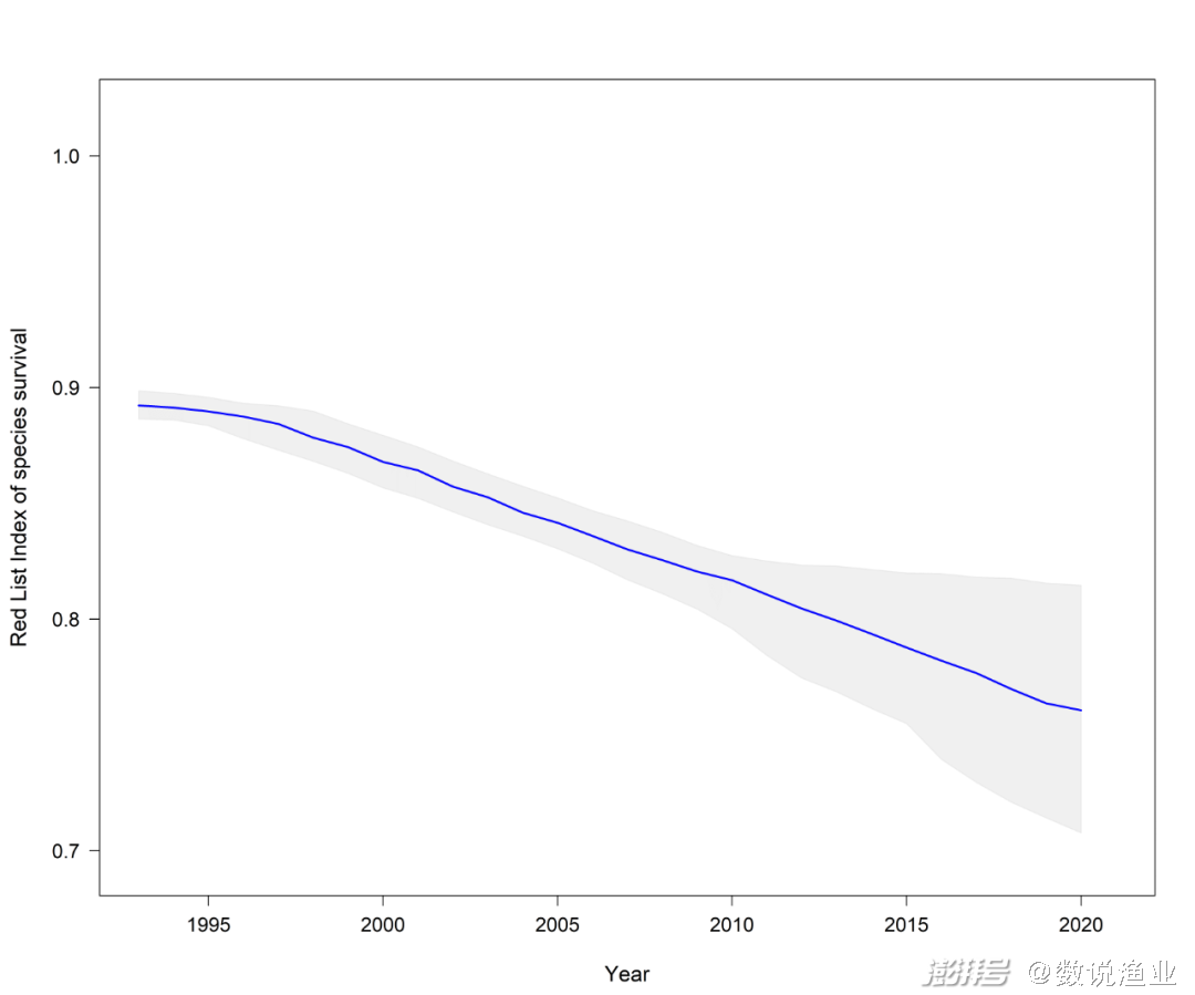 人们对物种保护虽然付出了大量人力物力,但如下图所示,表示海洋生物多样性丰富度的"RLI指数"仍旧呈下降趋势,表明近十几年来,全球海洋生物的总体濒危情况仍在持续恶化。要实现我们的美好蓝图,依然任重道远。