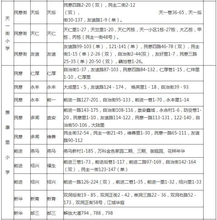 1.一小(1)龙井路以东—文化大道以西--兴新街以南—纸坊大街以北;(2)纸坊大街以南--宁安路以东—滨湖春天小区以西(含滨湖春天小区);(3)青龙山林场。咨询电话:87952432