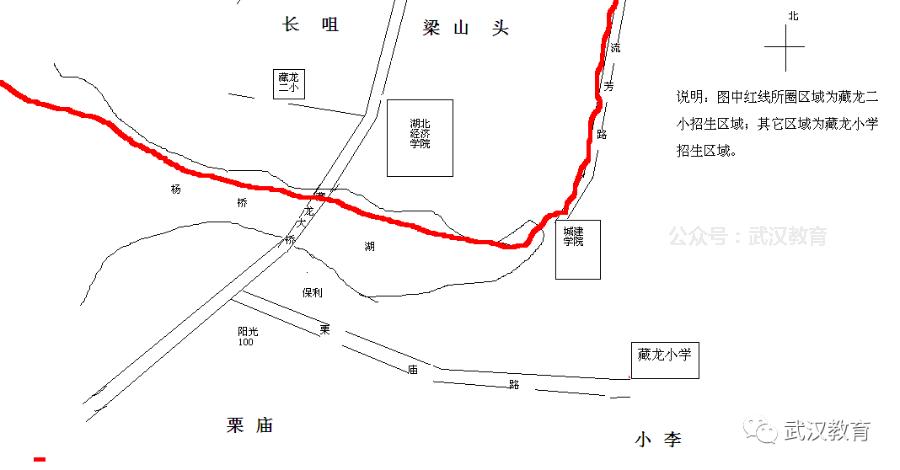 藏龙岛片区:江夏开发区藏龙岛高新技术产业园两所小学划片界线为:杨桥湖以北,流芳路以西为藏龙二小招生范围;其它区域为藏龙小学招生范围。