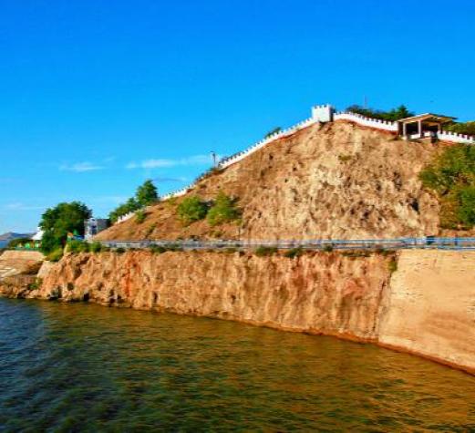 段选洮河,上下桥横,辟建园林恰川中积岛,堤坡布阵;环山起势,绕水生魂。路畔乔杉,河边弱柳,石径幽弯隐绿荫。涛声小,赏莺歌叶后,蝶恋花心。游人喜聚晨昏。夜幕下泉群焕彩喷。