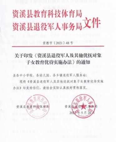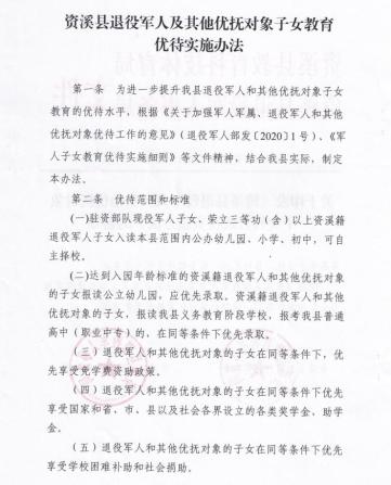 (二)达到入园年龄标准的资溪籍退役军人和其他优抚对象的子女报读公立幼儿园,应优先录取。资溪籍退役军人和其他优抚对象的子女,报读我县义务教育阶段学校,报考我县普通高中(职业中专)的,在同等条件下优先录取。