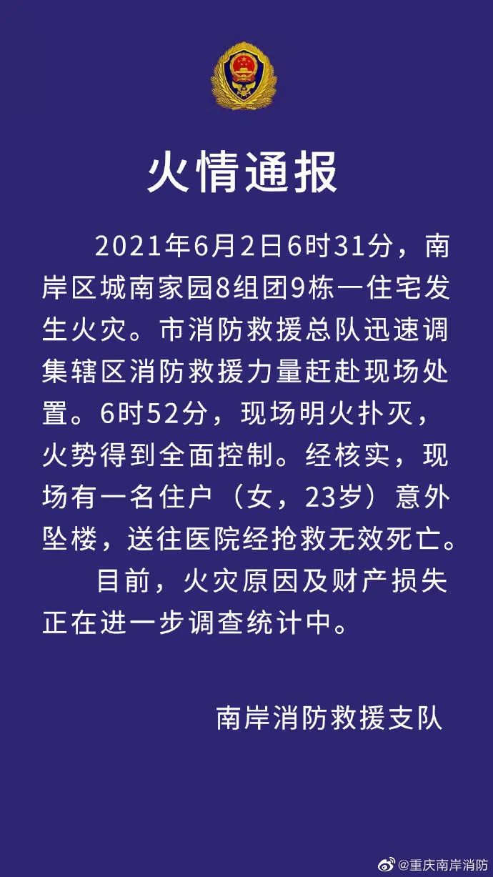 2021年6月2日6时31分,南岸区城南家园8组团9栋一住宅发生火灾。市消防救援总队迅速调集辖区消防救援力量赶赴现场处置。6时52分,现场明火扑灭,火势得到全面控制。经核实,现场有一名住户(女, 23岁)意外坠楼,送往医院经抢救无效死亡。