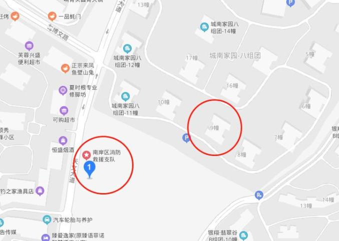 百度地图显示,着火楼栋不到一百米就是南岸区消防救援支队驻地。