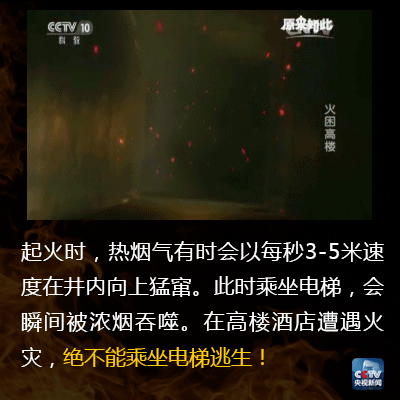 消防说,烟是往上面去的,你跑不过烟的速度,很有可能会吸入大量的烟气,有些人可能觉得往上跑到露台空气比较新鲜,到顶楼以后可以呼吸到新鲜空气,烟一旦上去之后,顶楼烟气吸入是很快的,所以有机会就一定要往下跑。