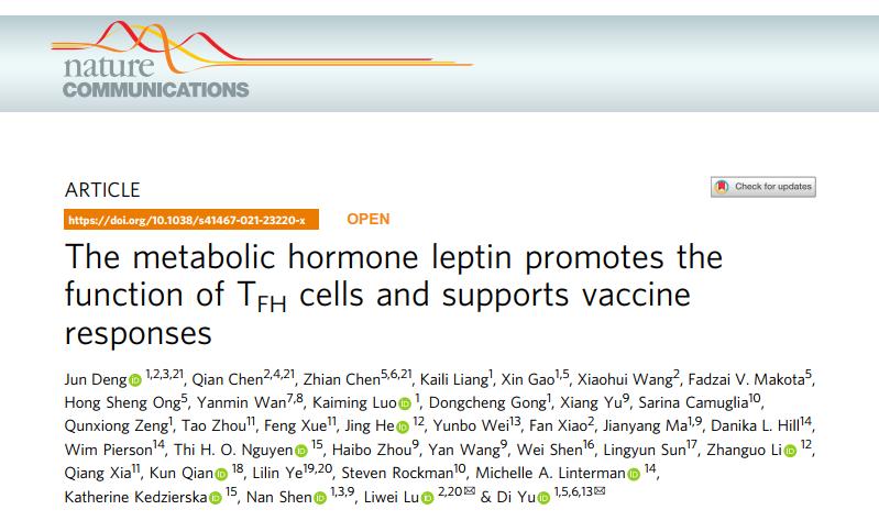 近日,《自然通讯》(Nature Communications,影响因子12.12)杂志在线发表了上海交通大学医学院附属仁济医院中澳个体免疫学联合中心、澳大利亚昆士兰大学余迪教授团队和香港大学吕力为教授团队的研究成果,揭示了瘦素调控滤泡辅助性T淋巴细胞并增强疫苗接种抗体反应,提示代谢异常导致的瘦素水平低下,或瘦素信号削弱是疫苗接种后抗体反应不足的重要风险因素。该研究为疫苗开发和疫苗有效接种提供了新的科学依据。