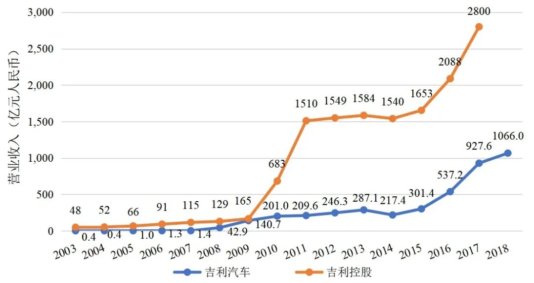 图1 吉利汽车、吉利控股2003-2018年营业收入