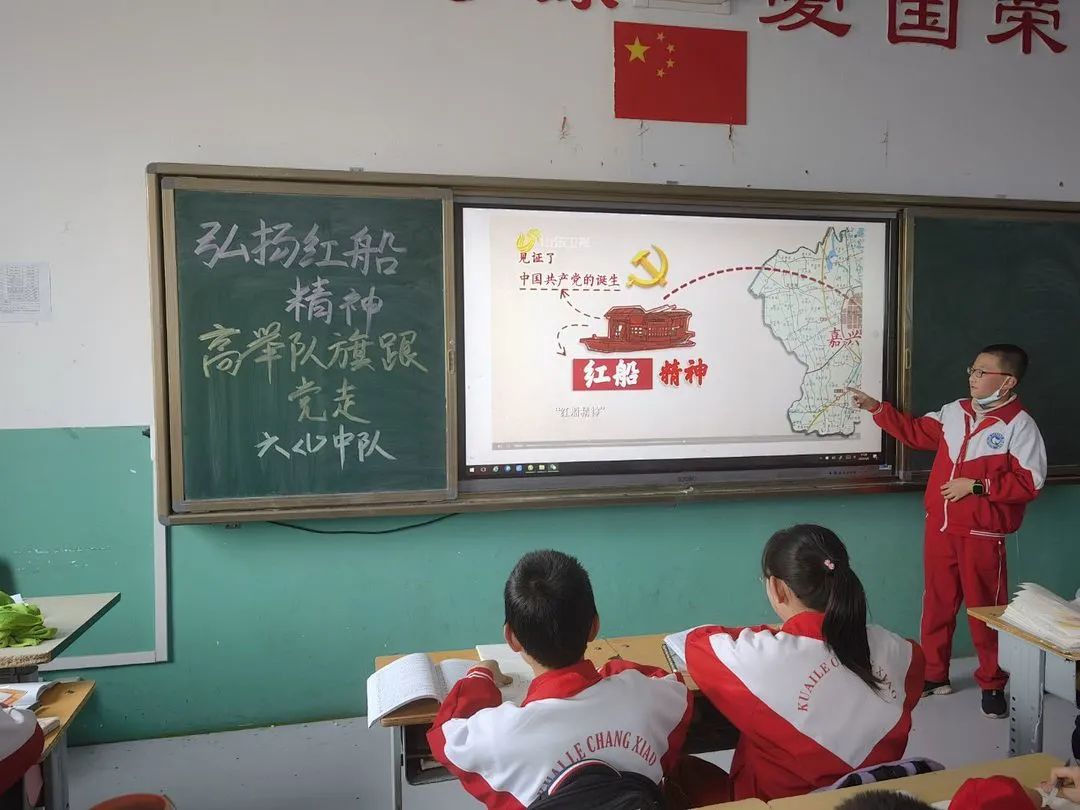 长江路小学在队课上通过“小手绘党旗”制作“小红船”的形式学习“红船精神”;