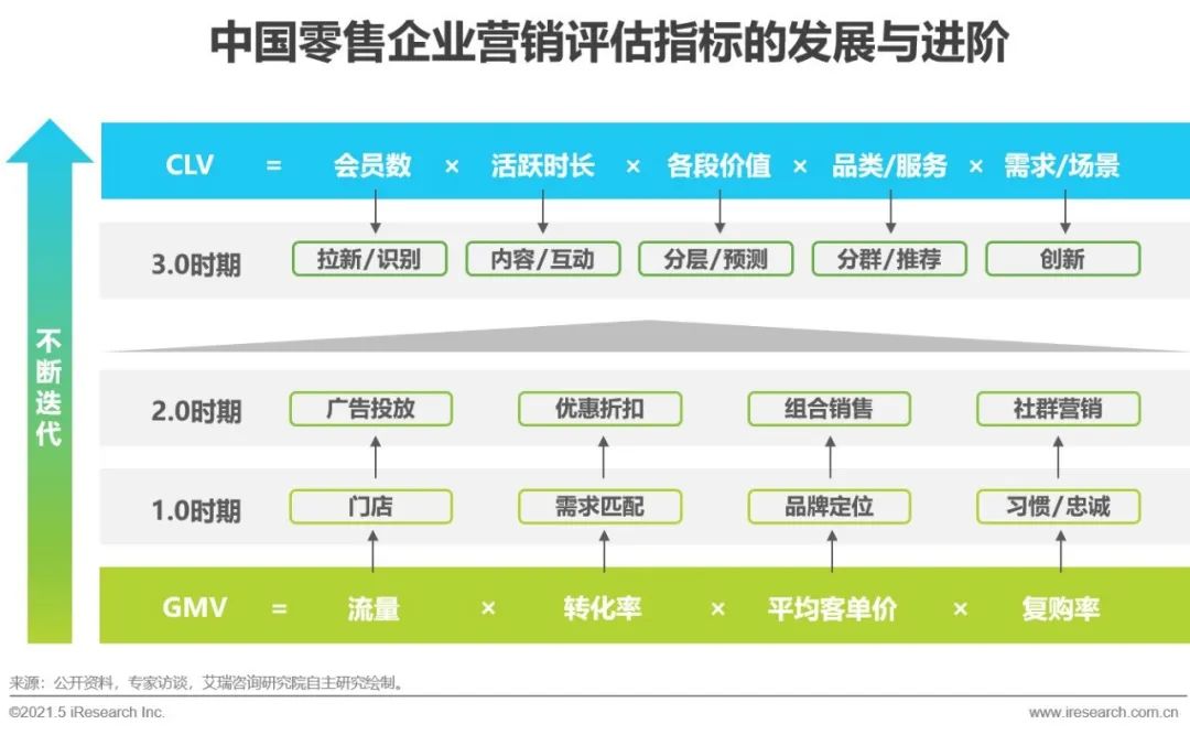 其一,战略转型,建立CLV价值评估体系。在互联网渗透率居高、流量红利趋缓、获客成本攀升的背景下,粗犷式营销对消费转化的助力作用不再明显,零售企业的营销目标从流量思维向单客思维升级,重视对用户消费生命周期(CLV)的精细化运营。相比GMV驱动时代下对流量、转化、客单价及复购率的追求,CLV驱动时代更加关注用户在全生命周期中的价值挖掘。