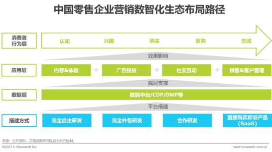 其五,技术准备,基于坚实底层基础搭建营销数智化生态矩阵。数据中台、CDP、DMP等平台在整个企业营销数据生态中扮演着底层基础设施的角色,负责各方用户数据的收集、整合及加工处理,几乎所有MarTech应用场景都需要基于底层架构搭建与落地。对零售企业来讲,夯实底层基础,建立以业务为导向的底层架构,也是为未来搭建完整、成熟的营销数智化生态矩阵提供优质的生长土壤。