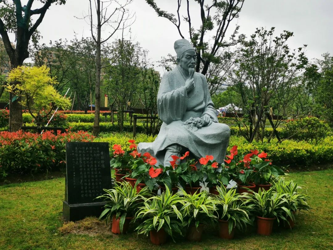 上海市书法协会会长丁申阳题写的“百草园”石刻旁,李时珍雕像巍然耸立。沿着蜿蜒的小路,7200平方米的“百草园”里有14个“园中园”:茶艺园、牡丹园、香草园、丹桂园、品味园、菜蔬园、藤蔓园、蔷薇园、红豆杉园……
