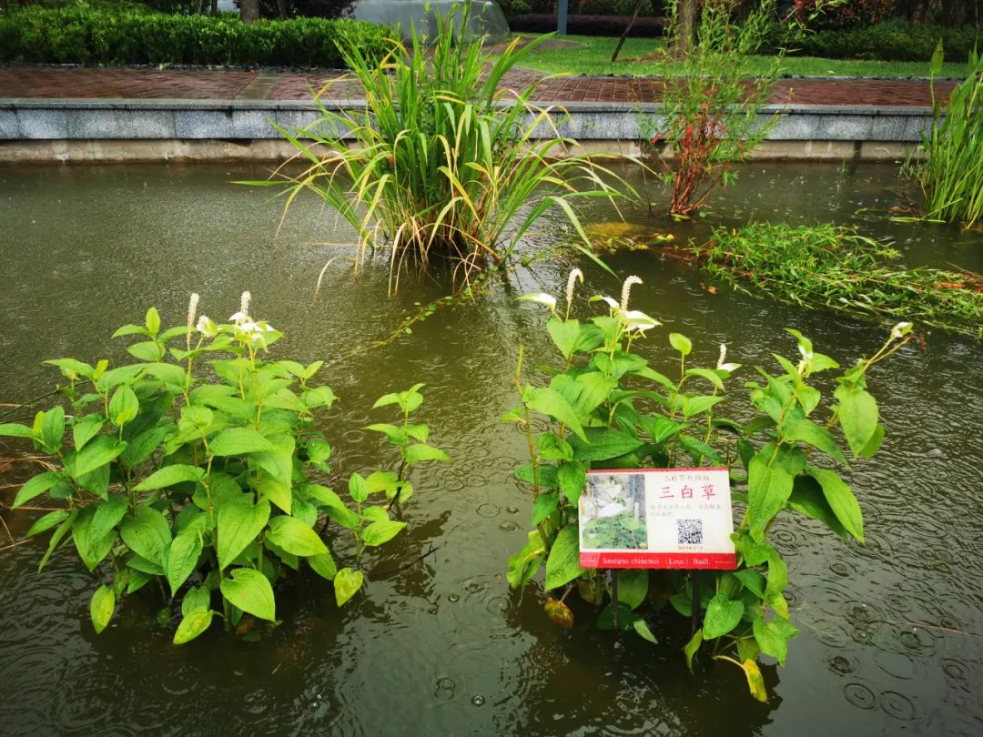 在水生园里,一种水生植物吸引了众人的目光:它开出的白色花朵酷似天鹅。微风吹拂,仿佛一群白天鹅在绿色湖面上游曳。走近一看,原来这么美的花名字是"三白草”:它的根茎和全草入药,可以清热解毒,利尿消肿。