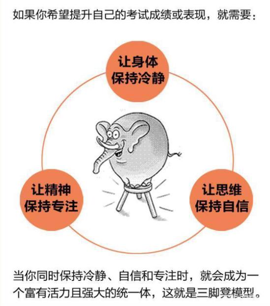 张喜燕医生提出:在复习或考试过程中,你的身体、思维和精神必须三位一体,通力合作才可以发挥出最佳水平,这三个要素就像是三脚凳的三条腿,一条腿是身体,一条腿是思维,一条腿是精神,三者必须具有同等的强度才能足够稳定。如果一条腿较弱或较短,那么另外两条腿就会受到额外的压力,从而会摇晃并最终失去稳定性。