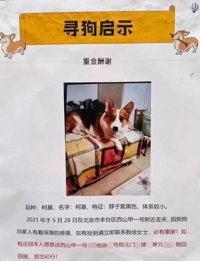根据这则寻狗启事,北京的徐女士在丰台区丢失自己的爱犬,启事内容显示,“如有送回,本人愿意送西山甲一号XX地块X号院北门X楼X单元XXX”作为回报。
