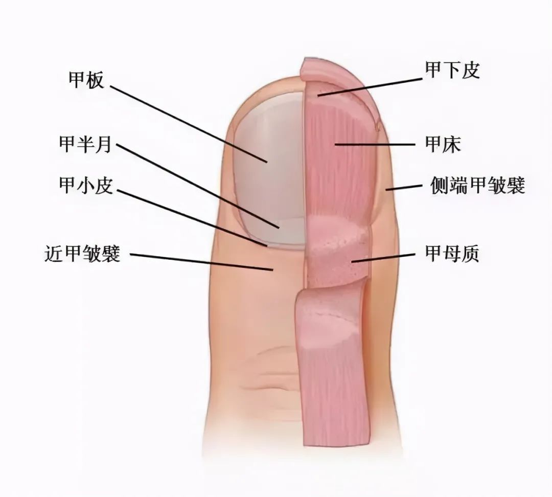 一个正常且完整的指甲,主要由甲板、甲床、甲母质、近端/侧面甲皱劈和甲小皮、甲下皮等组成。