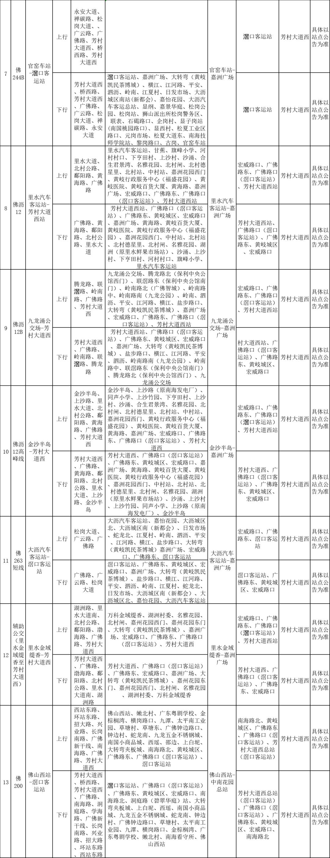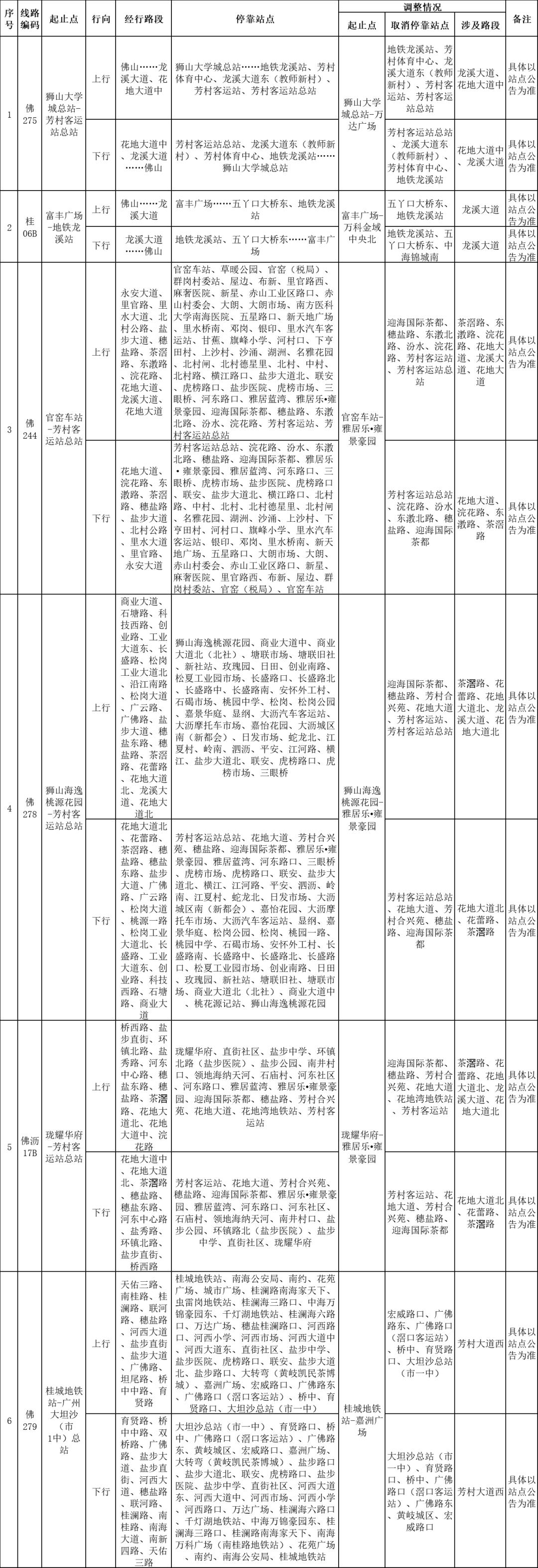对途经广佛路的佛279、佛244B、佛沥12、佛沥12B、佛沥12高峰线、佛263短线、辅助公交(里水金域缇香至芳村大道西)等7条公交线路截短至“嘉洲广场”;佛200、佛250等2条公交线路广州方向的首末站调整至“中南花园总站”;佛277路广州方向的首末站调整至“金地悦荔”;佛236、佛251等2条公交线路广州方向的首末站调整至“九龙公园”;佛263路广州方向的首末站调整至“大沥汽车站”;