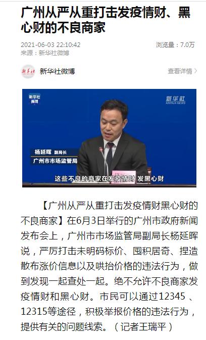 在6月3日举行的广州市政府新闻发布会上,广州市市场监管局副局长杨延晖说,严厉打击未明码标价、囤积居奇、捏造散布涨价信息以及哄抬价格的违法行为,做到发现一起查处一起。绝不允许不良商家发疫情财和黑心财。市民可以通过12345 、12315等途径,积极举报价格的违法行为,提供有关的问题线索。