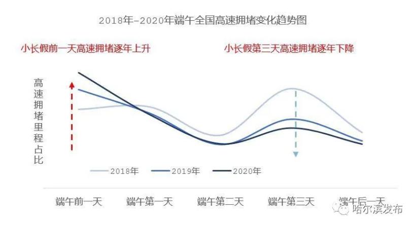 据统计,2018 年至 2020 年,端午假期全国高速拥堵里程呈逐年下降的趋势,而端午假期前一天的全国高速拥堵里程占比却逐年上升。可见,小长假公众错峰出行习惯已初步养成。