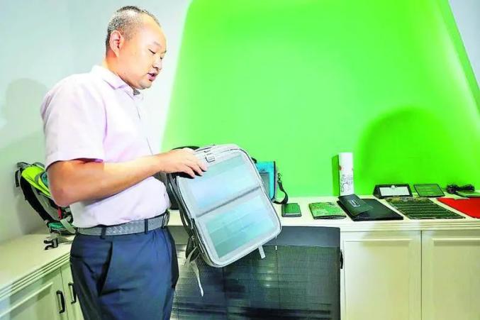 一走进展厅,代习军就拿起展台上的红色“纸张”反复曲折,和普通纸张不同的是,这张“纸”的边缘隐藏着一个接口,如果不是仔细翻看,很难发现。“这其实是户外充电纸,整个纸张都是太阳能板,能够在阳光下储存电能,给手机充电。”代习军介绍,为了满足许多户外旅行者的用电需求,他们还把太阳能板装在了背包上,只要用户背着包在阳光下走,背包就能自动储能,为手机、平板电脑等电子设备充电。