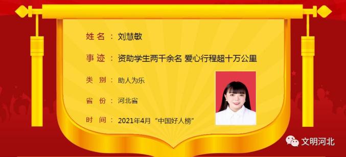 近日,中央文明办发布2021年4月“中国好人榜”,我省6人光荣入选。其中,我市刘慧敏(刘格格)榜上有名!截止目前,我市共有187人荣登“中国好人榜”。