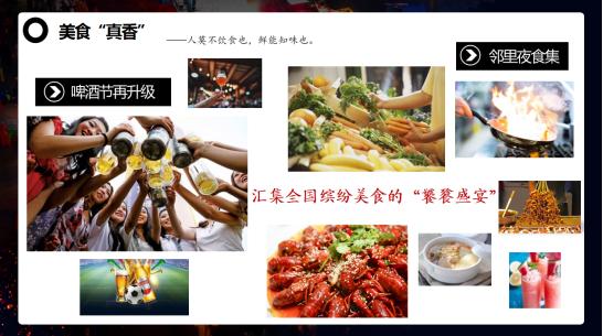 推出集美食、阅读、运动、文化为一体的“真香”板块夜市。美食“真香”,新业坊特设“邻里夜食集”充分融合商场传统美食和各地街头特色小吃,突破传统啤酒节限制,将美食、足球、音乐节完美结合,营造更具特色的人间烟火气。阅读“真香”,以新业坊光海书店为起点,打造“以书会友”的全民阅读季,提供公益换书,公益义卖等活动,实现环保节能、资源共享的良性循环经济。