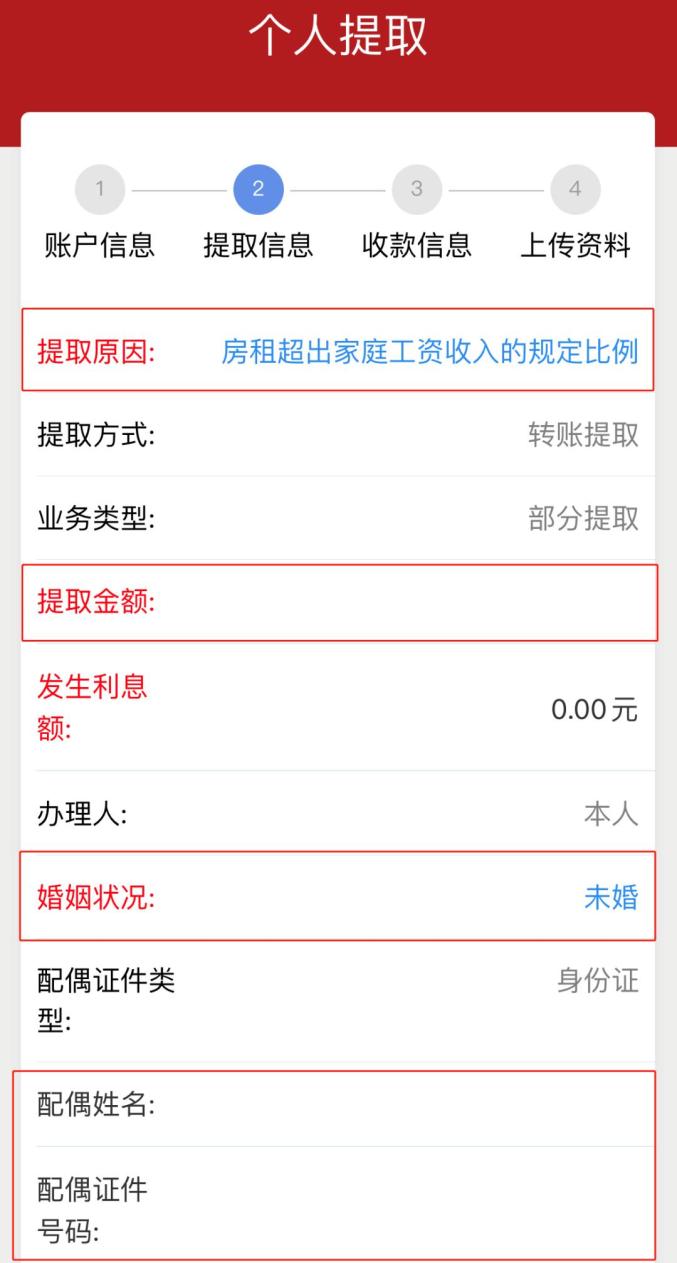第二步:在提取原因处选择“房租超出家庭工资收入的规定比例”;