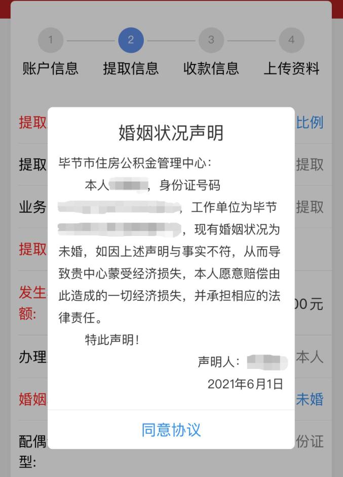 在婚姻状况处选择您的婚姻状况,若您是已婚,则需要在下面输入您的配偶姓名和配偶证件号码,若您是未婚、离异等情况,则需要签署一份电子婚姻状况声明书,阅读完以后点击同意协议即可。