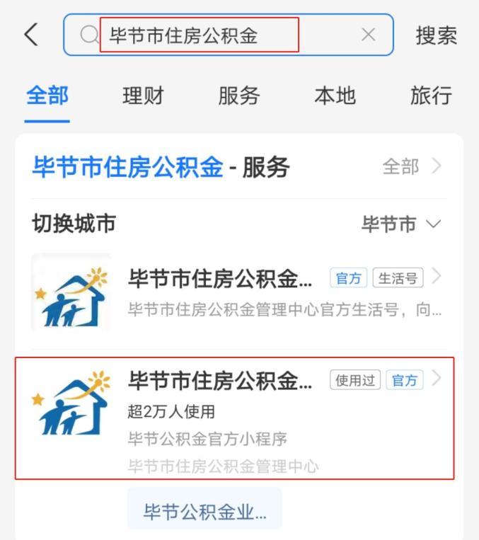 如果您想在支付宝APP办理的话,您可以直接在支付宝首页输入“毕节市住房公积金”,点击下方的毕节公积金官方小程序,登陆之后即可办理,具体操作同微信小程序一样。
