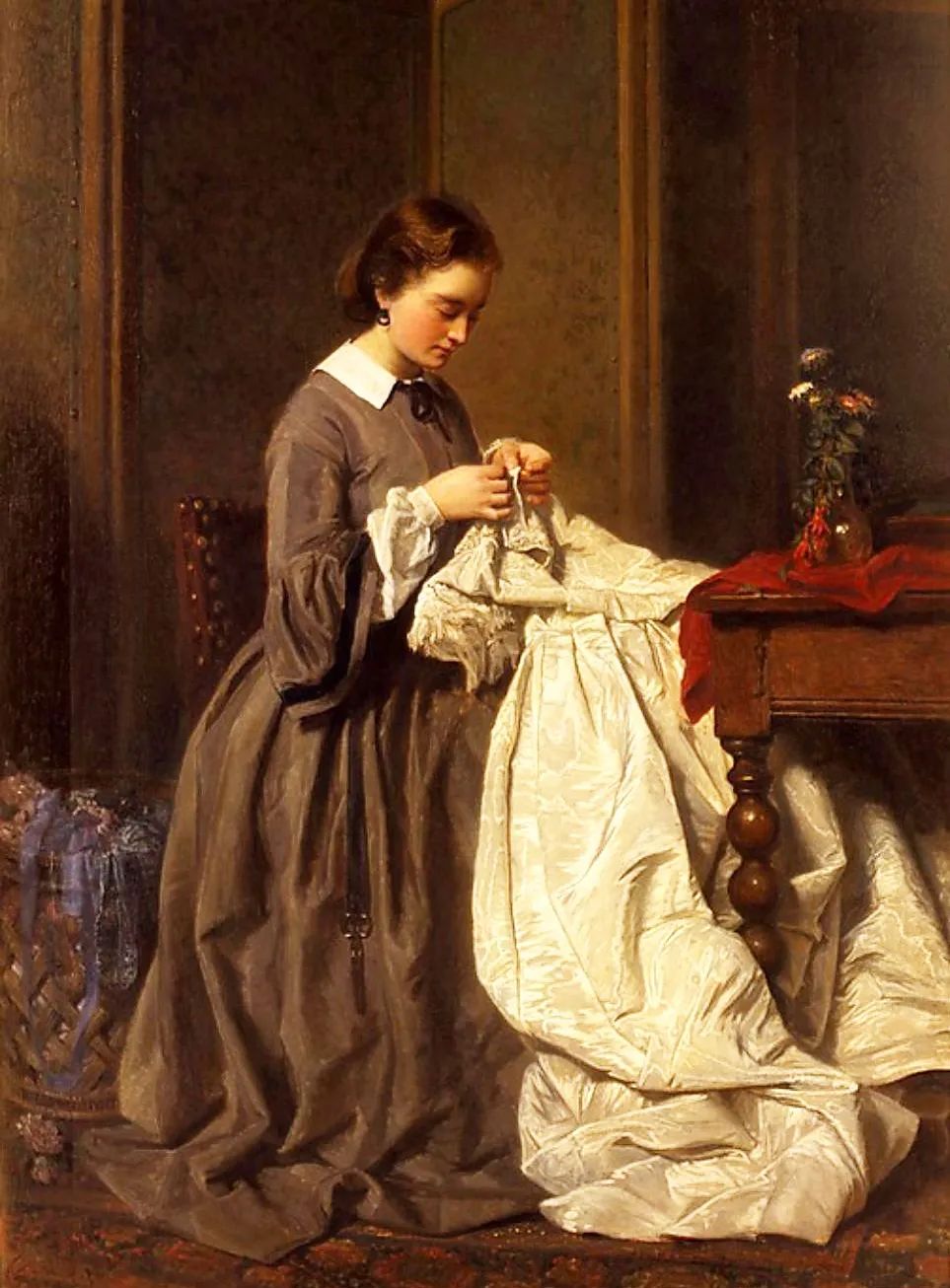 在这幅19世纪Charles Louis Baugniet的油画中,女家教正缝制着她不曾穿过也负担不起的绸缎华服