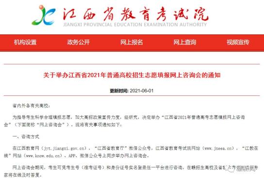 2021年我省高考继续分2次集中填报志愿(志愿设置及填报时间安排另行发布),为指导考生科学合理填报高考志愿,省教育厅、省教育考试院将于6月25日至28日邀请省内外在赣招生高校共同举办“江西省2021年普通高考志愿填报网上咨询会”。同时,我们还会制作一系列的高考志愿填报指导动画视频,以更直观、更形象的方式帮助考生和家长解读高招政策。请大家密切关注江西教育网、江西省教育考试院网、江教在线网,江西省教育厅、江教在线微信公众号,江教在线APP以及江西教育电视台,及时了解最新的政策和信息。不要轻信非官方渠道发布的不实信息和一些高收费的志愿填报辅导机构,谨防上当受骗。