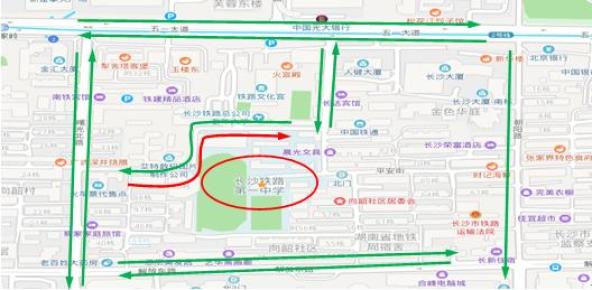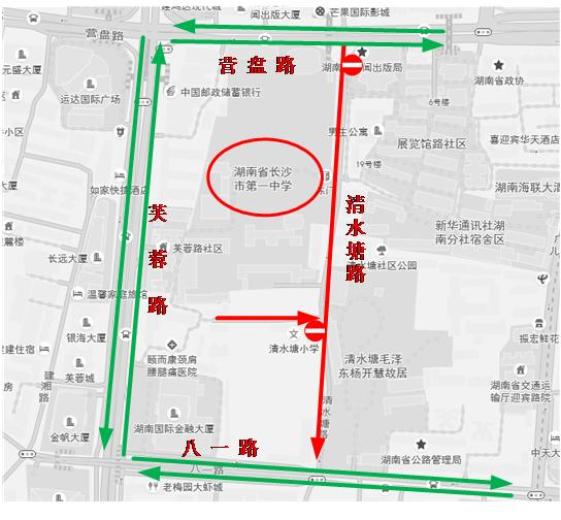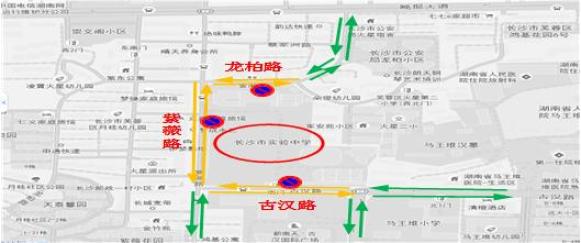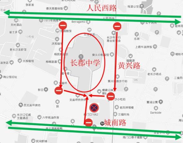 6月7日至9日7:00-12:00,13:30-18:00,长郡中学周边道路实行临时性交通管制,分别在人民路黄兴中路后街口、劳动新村口,城南路长郡中学路口,长郡中学南门外小巷以东60米和长郡中学南门外小巷以西300米巷口设立卡车点,禁止除持高考通行证以外的车辆驶入;长郡中学南通道禁止一切车辆停放;前1小时至考后半小时,禁止与高考无关的车辆驶入城南路南门口至书院路口路段。