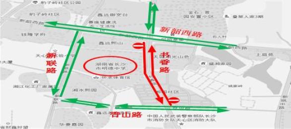 高考期间,对潇湘大道望月湖路口实行临时性交通管制,禁止与高考无关的机动车辆进入。对望月湖小区道路按照已制定的微循环单向交通组织实施交通管理措施。