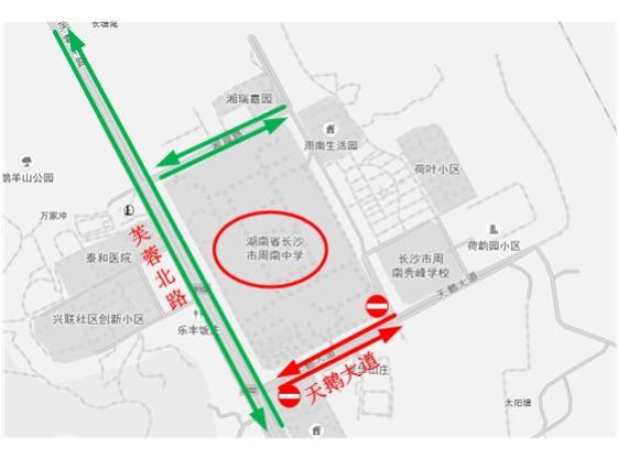 高考期间,将在芙蓉路天鹅大道路口设置卡点,禁止所有与高考无关车辆进入天鹅大道;在天鹅大道鹅秀路口设置卡点,禁止车辆驶入周南中学校门路段。