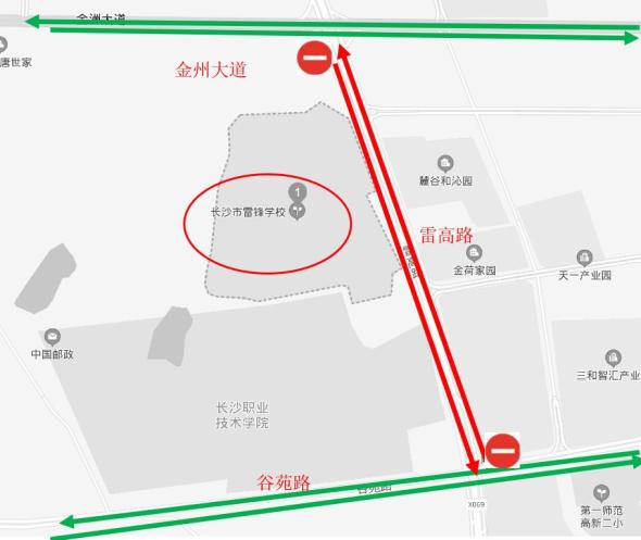 雷高路谷苑路口禁止大型货车和与高考无关的大型客车绕道通行;警用摩托车对雷锋中学周边道路进行不间断巡逻管控,确保主干道畅通。金洲大道雷高路口禁止考试期间一切无关车辆(送考车、公交车可通行)进入管制区(学校门口第一幅车道)。雷锋中学校门口警力疏导,指挥车辆即停即走。枫林三路的麓云路口、桐梓坡路的玉兰路口、岳麓大道麓谷大道路口摆放巡逻摩托车,处突保畅。