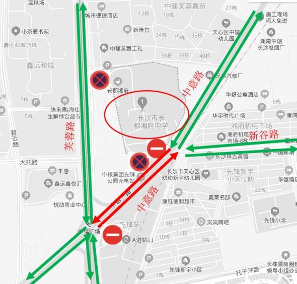 6月7日至9日7:00-12:00,13:30-18:00,中意路新谷路至芙蓉路路段实行临时性交通管制,考前1小时至考后半小时,禁止除高考通行证以外的车辆驶入;禁止车辆在长郡湘府中学门前通道内停放;新谷路中意路至黄谷路路段允许送考车辆停放在南北两侧的道路上;果子园路段允许送考车辆平行路沿停放在东西两侧的道路上。