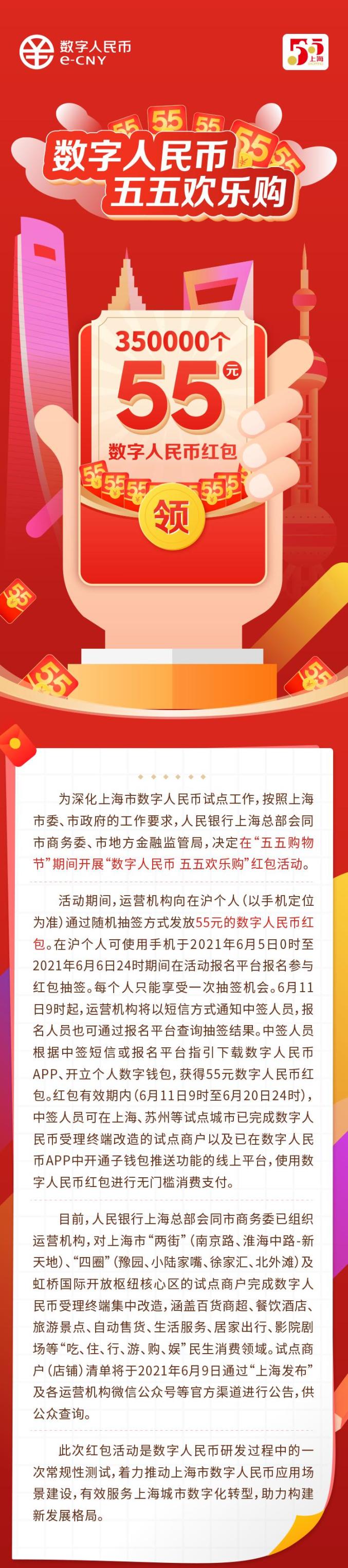 上海已于2021年6月5日0时,开启“数字人民币 五五欢乐购”红包活动。发放35万份数字人民币红包,每份金额55元,所有手机定位在上海市的公众均可参与报名。