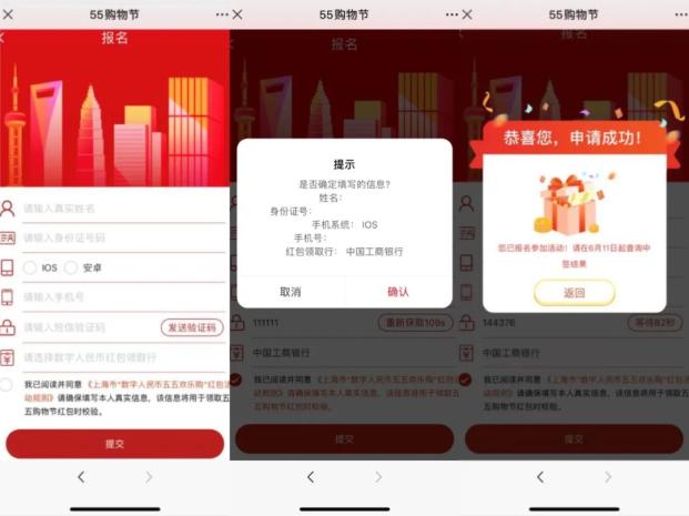 2、依次填写姓名、身份证号码、iOS/安卓、手机号、选择红包发放运营机构,勾选“我已阅读并同意《上海市“数字人民币五五欢乐购”红包活动规则》”选项,获取手机验证码并点击提交。点击“提交”后进行信息确认,确保提交信息正确无误。点击“确认”后,出现申请成功提示。点击返回,报名流程结束。