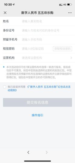 2、进入报名页面,填写姓名、身份证号、手机号,点击“获取短信密码”按钮后填入短信密码,选择红包发放运营机构,勾选“我已阅读并同意《“数字人民币 五五欢乐购”红包试点活动规则》”后“提交报名信息”按钮亮起,点击即可报名。报名成功后出现相关提示。