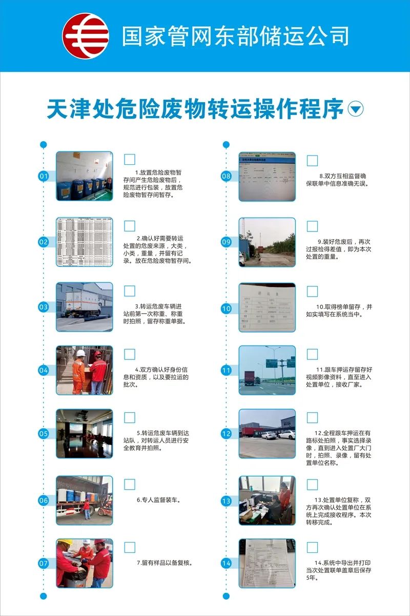 天津处加强危险废物、固体废物收集转移处置全过程管理,根据《天津市危险废物综合监督管理系统》处置流程要求,结合生产实际,自主印制海报,明确重要节点,基层各单位可参照执行,确保“废渣”去向依法合规。