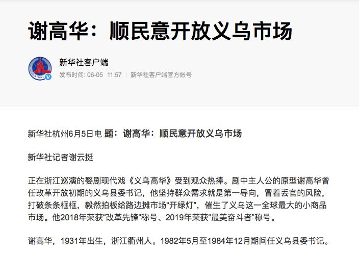 正在浙江巡演的婺剧现代戏《义乌高华》受到观众热捧。剧中主人公的原型谢高华曾任改革开放初期的义乌县委书记,他坚持群众需求就是第一导向,冒着丢官的风险,打破条条框框,毅然拍板给路边摊市场“开绿灯”,催生了义乌这一全球最大的小商品市场。他2018年荣获“改革先锋”称号、2019年荣获“最美奋斗者”称号。