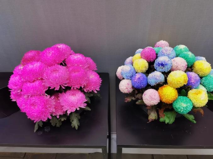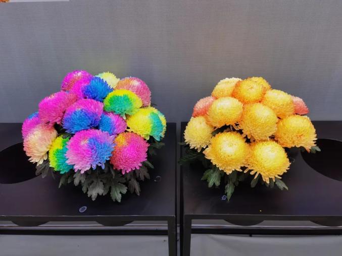 其中,展示的彩色菊花是通过现代科技,结合菊花特性,调配吸收后焕发出的绚丽色彩。尤其是盆栽七彩菊,花色缤纷,似七色彩虹,是技术人员赶在花博会前刚开发的新技术产品,这也是它第一次对外展出。
