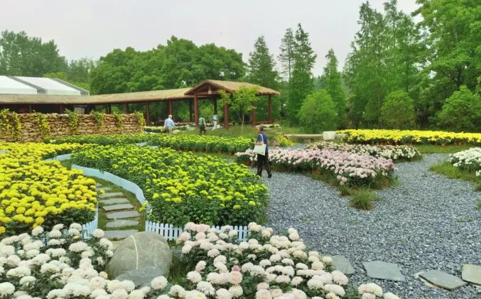 整个菊园占地面积约2万平方米,分为室外和室内两大展区。室外展区主要由花海景观区和东篱小院等部分组成。在花海景观区,展出了近10万盆菊花,大规模地使用了多种颜色的乒乓菊,景象壮观,这在国内尚属首次。
