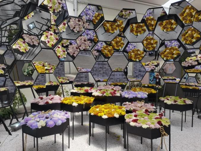 室内精品馆选用镜面、竹子等元素搭建展台,集中展示色彩丰富的精品菊花,让传统菊花的清雅、现代菊花的时尚感都得以体现。